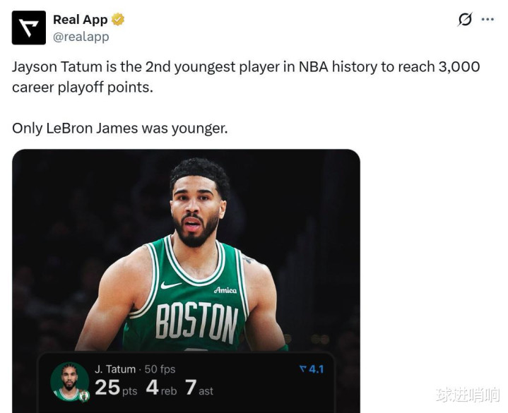 凭借这么的阐扬,塔图姆一战迎来双里程碑的同期,也创造了一项仅次于詹姆斯的历史记录。