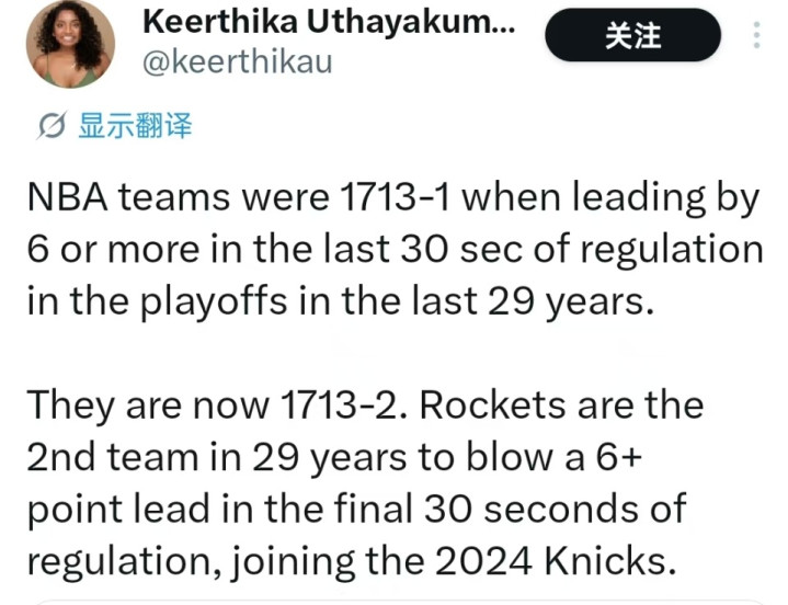 季后赛这种情况下输球有多离谱?ESPN数据披露,昔时29年季后赛,老例本事临了30秒高出至少6分的球队,战绩为1713胜1负,胜率高达99.94%,而本场事后,这一记录更新为:1713胜2负。火箭成为第二个欺侮的失利者,而第一个是2024年的尼克斯。